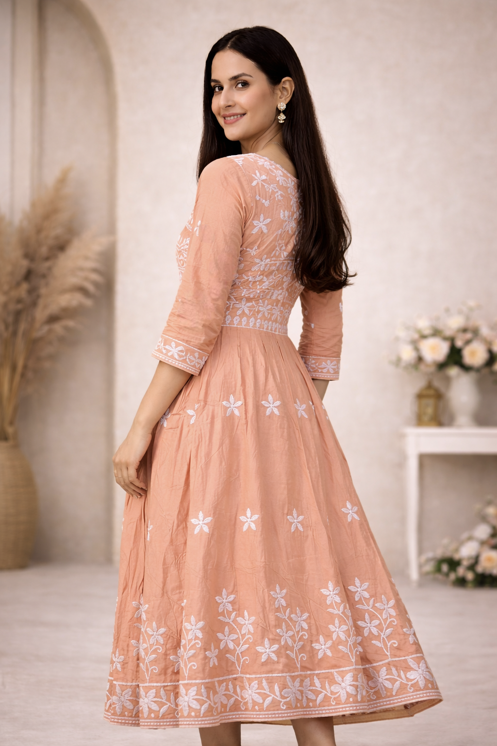 Add timeless elegance to your ethnic wardrobe with this IRALOOM Peach Cotton Embroidered Anarkali Kurti, crafted for women who love subtle luxury and everyday comfort.